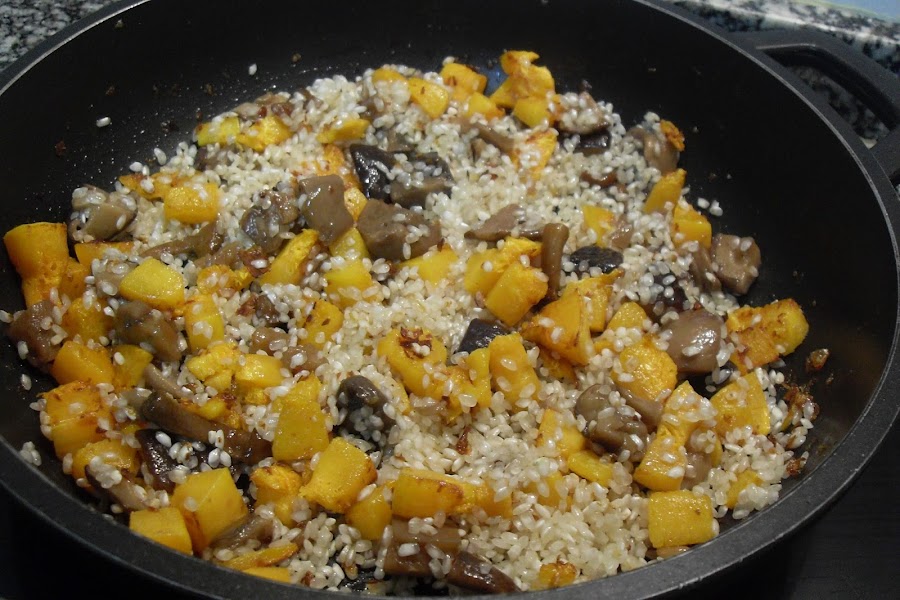 Añadir el arroz, las setas y el vino blanco, rehogar y remover para que se evapore el vino.