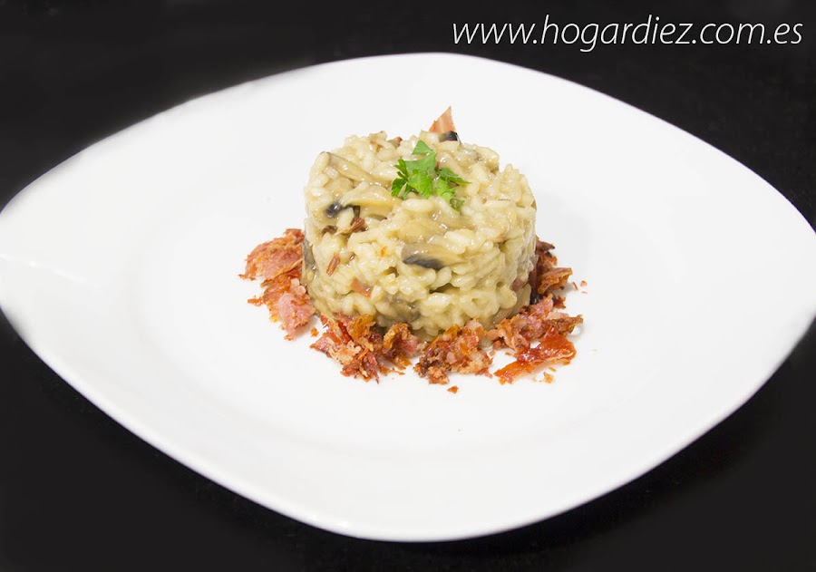 Para hacer el crujiente de jamón, ponemos las 4 lonchas de jamón en un plato encima de papel de cocina y también tapadas con papel. Las introducimos durante 3 minutos en el microondas a máxima potencia. Retiramos el papel y picamos en el mortero el jamón hasta que esté totalmente desmenuzado. Adornamos el rissotto con el jamón y ya tendremos listo nuestro plato.