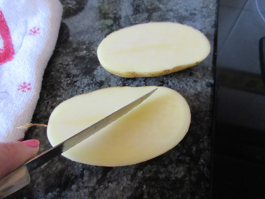 Lavamos las papas a conciencia, la comeremos con la piel, hacemos unos cortes y salpimentamos.