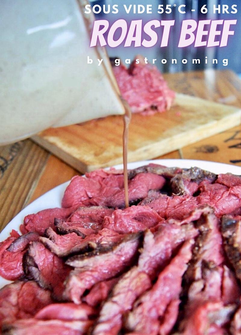 Encontrarás millones de formas de preparar un rosbif, distintos tiempos, temperaturas y cómo no, aderezos, la verdad es que sal y pimienta bastarían, pero eso dependerá de lo que a ti más te guste, esta receta es clásica, pero lo permite “casi” todo, con respeto como siempre, y qué decir del corte de carne que se usa para hacerlo, aquí hay para todos los bolsillos, puedes usar tapa, cadera, aguja, lomo alto o bajo, incluso redondo, aunque yo prefiera el lomo bajo por su buena infiltración de grasa y magro sabroso, tú puedes elegir el corte que más te guste y el bolsillo te lo permita. Yo aprendí hace muchos años ya, a hacer un rosbif braseándolo previo al horno junto con una mirepoix de verduras, el problema de hacer esto en sous vide es que, primero, a esta temperatura, las verduras no se cocinarán y segundo, al no tostarlas, no aplicamos el principio de Maillard del que ya te hemos hablado varias veces en Gastronoming, no se producirá, por ende, no se caramelizarán los azúcares de las verduras y no nos aportarán sabor, es más, lo más probable es que nos resten sabor de carne ya que absorberán los jugos de la carne, así que lo haremos sin verduras.