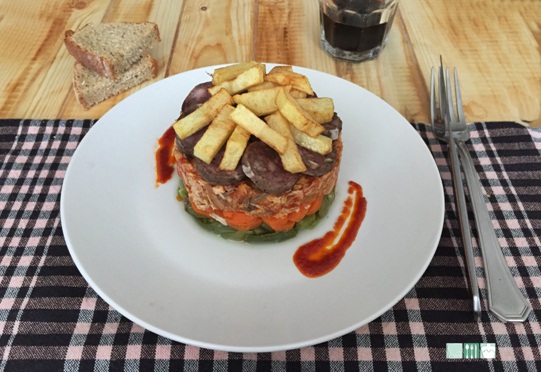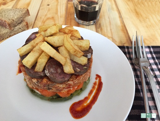 Con un aro de emplatar, yo coloqué en la base las judías, y fui haciendo capas, zanahorias, el conjunto del pollo sofrito con el tomate, el butifarrón en rodajas y unas patatas fritas para coronar nuestra roba bruta.