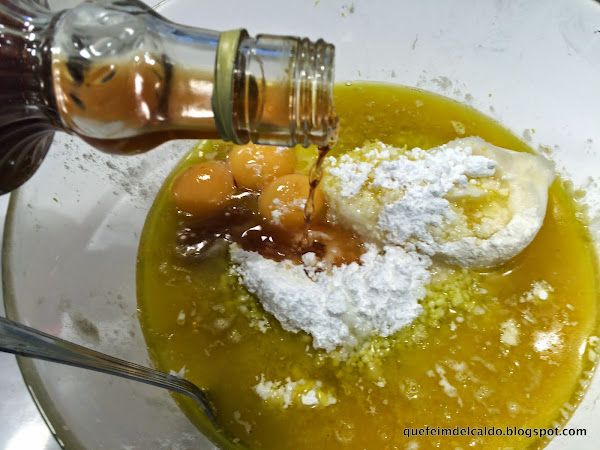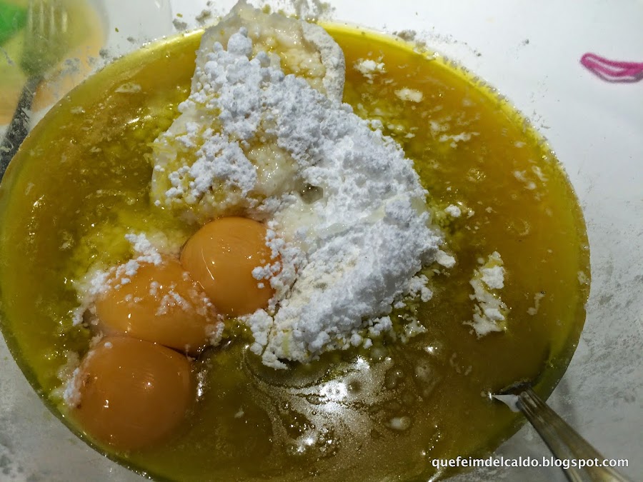Y por último colocamos las yemas de los huevos, la ralladura del limón y la naranja.