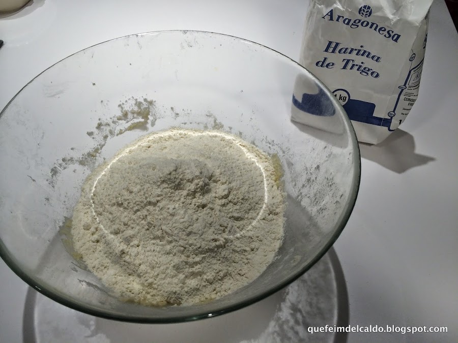 Colocamos en un bol la harina junto con el azucar, mezclamos bien.