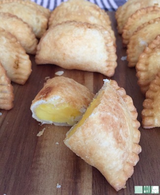 Me remonto años atrás con esta receta, una tía de mi marido preparaba estos robiols fritos en Semana Santa, mi anotación de la receta tan solo era un vaso de leche, un vaso de manteca fundida, una pizca de sal y harina. Para el relleno preparar un flan espeso Potax, eso sí que lo tenía claro, era el mejor para que al freírlo no se saliera, y como se puede apreciar en el corte está totalmente compacto.