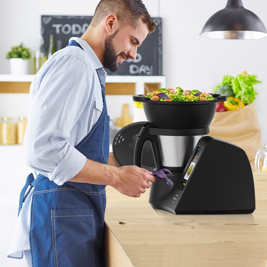 De esta forma, cocinar con ayuda del robot será tan sencillo como escoger qué queremos comer ese día entre su amplio recetario (que, además, se va actualizando), y seguir el paso a paso guiado y asistido que aparecerá en la pantalla. Además, también tenemos la opción de cocinado manual, en la que usaremos el robot como una herramienta de cocina con múltiples funcionalidades: triturar, rallar, emulsionar, montar, amasar, sofreír, cocer, moler, picar…Por su parte, este robot permite la cocción simultánea de hasta 4 niveles para ahorrar tiempo: jarra, cestillo y accesorio vapor de dos niveles. Y como contaremos con la información nutricional de las recetas a través de la App Mycook, nuestra cocina será más saludable.