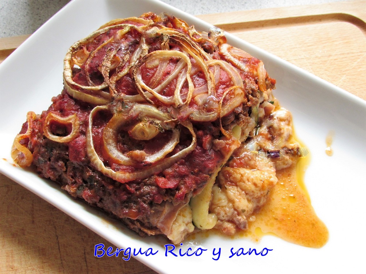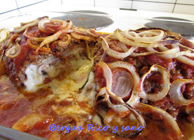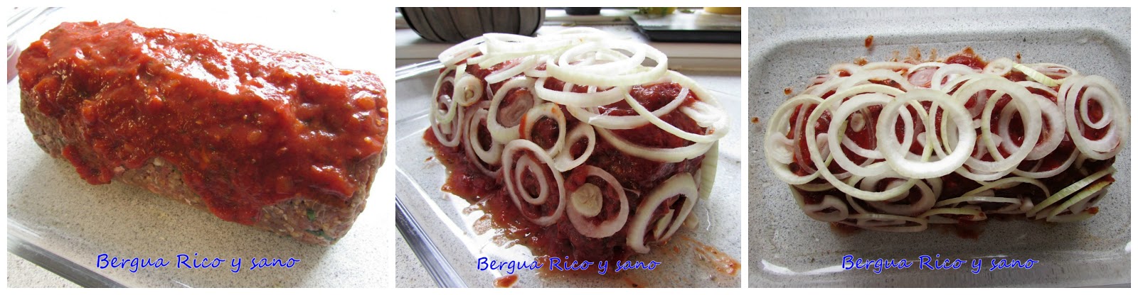 7. Repartimos la salsa de tomate por encima y por los lados de nuestro rocambole, para que no se seque. Por la parte de arriba repartimos la cebolla cortada en aros ni muy finos ni muy gruesos. El detalle de la cebolla vale la pena, queda riquísimo y también queda bonito.