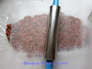 3. Para aplanar y repartir la carne en forma rectangular, podemos usar un rodillo directamente sobre la carne o sobre papel de horno. Que nos quede de un grosor de unos unos 0,5 cm; a mí se me quedó fino de más en el de la foto. Entonces salpimentamos.