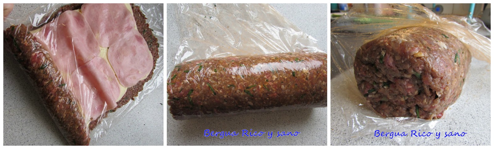Esta receta es una especie de brazo de gitano o pionono salado en el que la base es la carne. También existen el rocambole de bizcocho, de tortilla y hasta de yuca. Entre los de carne, los hay que se decoran con panceta por arriba, envueltos en bacon o, como yo lo traigo hoy, con salsa por encima. En cuanto a la carne, la más tradicional para esta receta es la de ternera, pero también sirven el cerdo, el pollo y el pavo, por ejemplo. Yo no me he podido resistir a añadir alguna verdura. Me inspiré en varias recetas, sobre todo en esta.