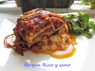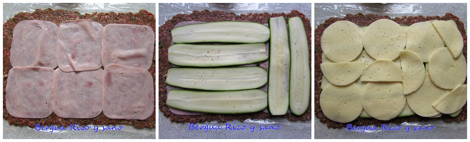 4. Procedemos a rellenar: primero lonchas de jamón york, después lonchas de calabacín (cortadas con una mandolina) y finalmente lonchas de queso (las mías tirando a gruesas). Yo añadí una capa más de jamón porque las lonchas eran muy finas. No hay que cubrir la superficie de la carne hasta los bordes, para que no se nos desborde al cerrar.