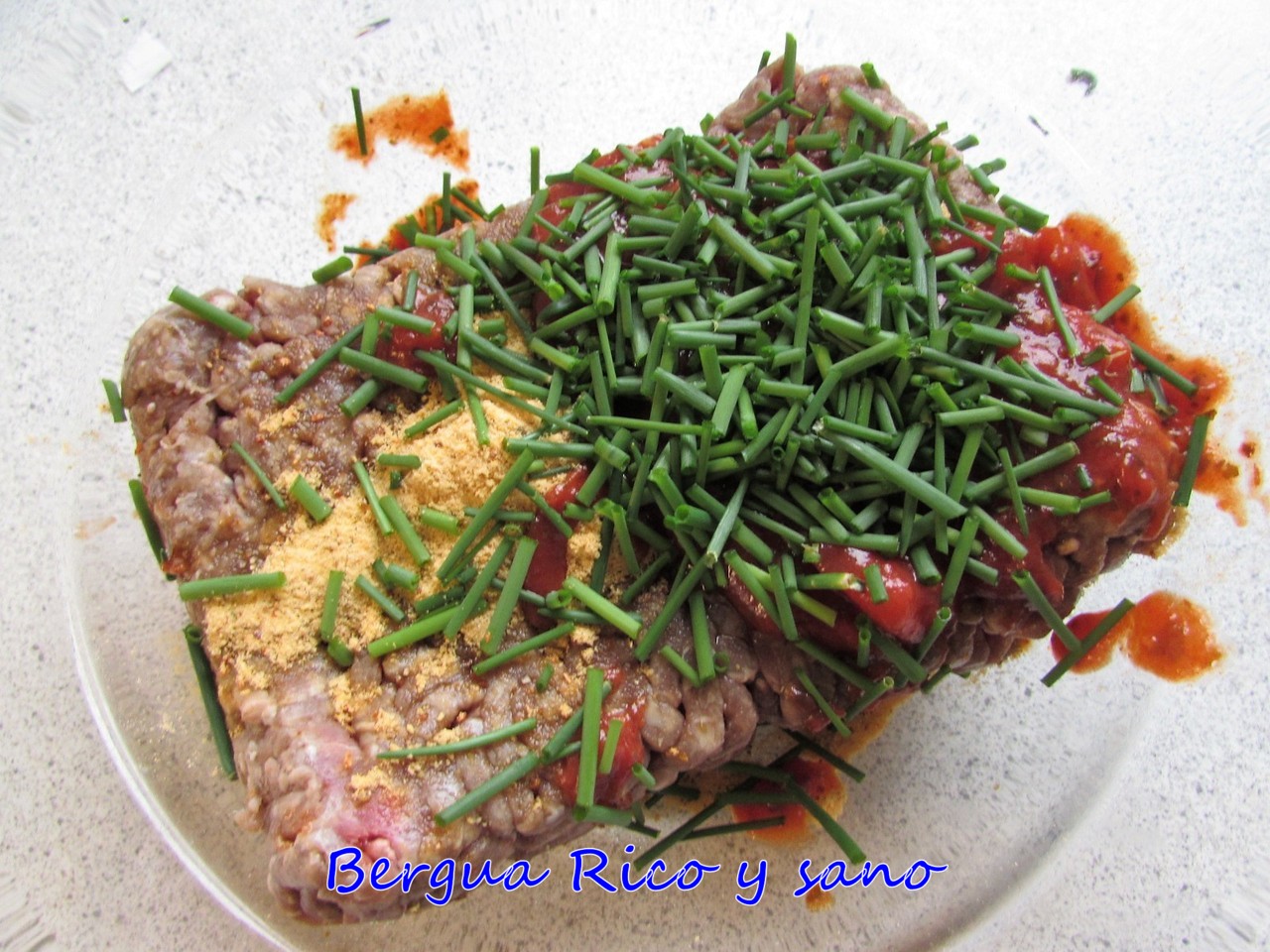 1. Colocamos la carne picada en un recipiente; añadimos un chorrito de aceite, la sopa de cebolla en polvo, el cebollino picadito y las dos cucharadas de salsa de tomate. Mezclamos bien con un tenedor o una cuchara, o bien con la mano (mejor si usamos un guante o una bolsa de plástico, para que no se nos pegue a la piel). Si tenemos tiempo, dejamos que la mezcla repose durante 10 minutos.