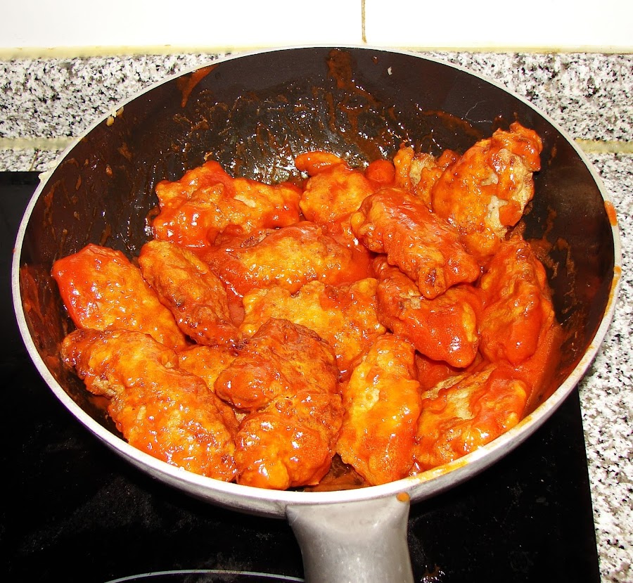 Una vez eliminado el exceso de aceite, se pone en una sartén la salsa de tomate y se incorporan las rocas.