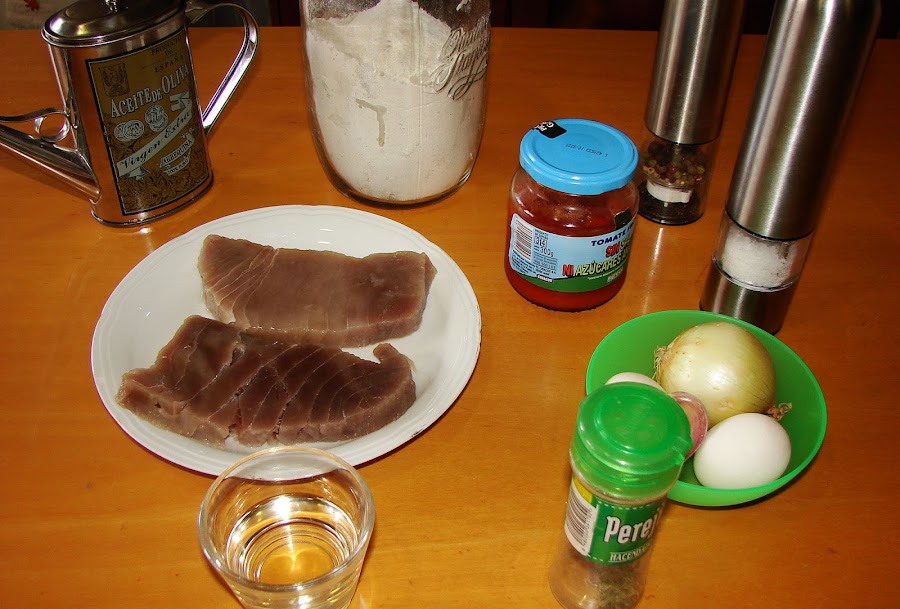 300 gr. de atún fresco (puede ser congelado), 3 huevos, media cebolla o una pequeña, un diente de ajo, aceite de oliva, salsa de tomate, un tercio de vaso de vino blanco, harina, una cucharadita de perejil picado, sal y pimienta.