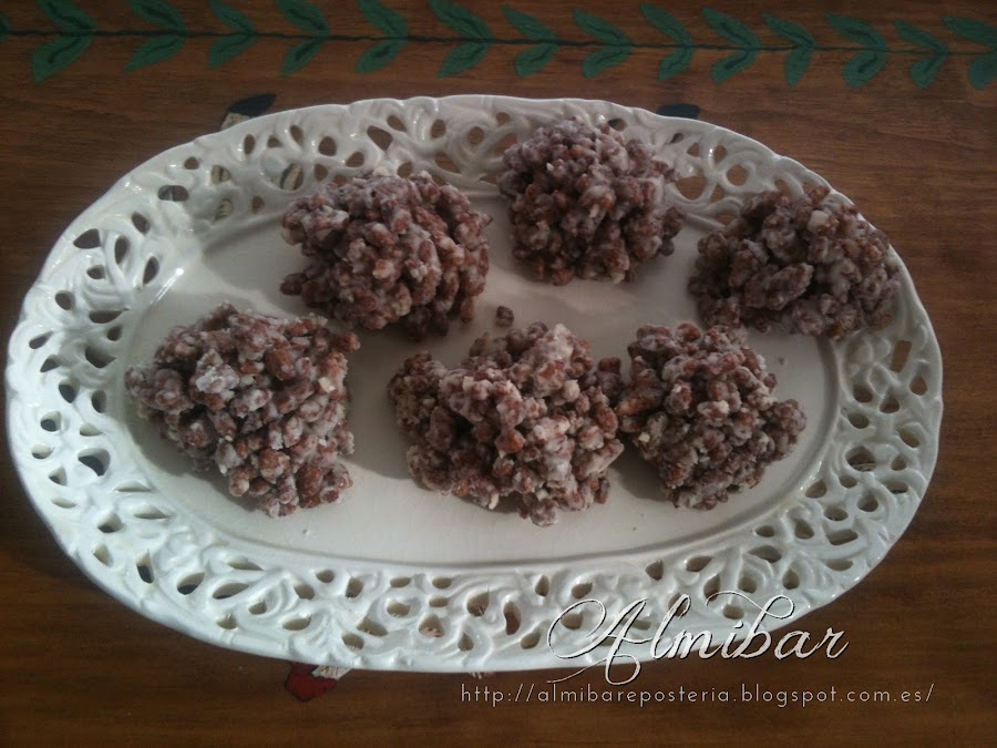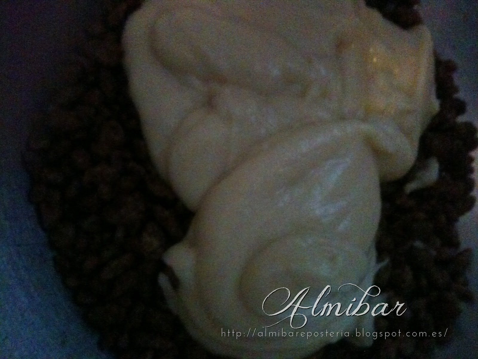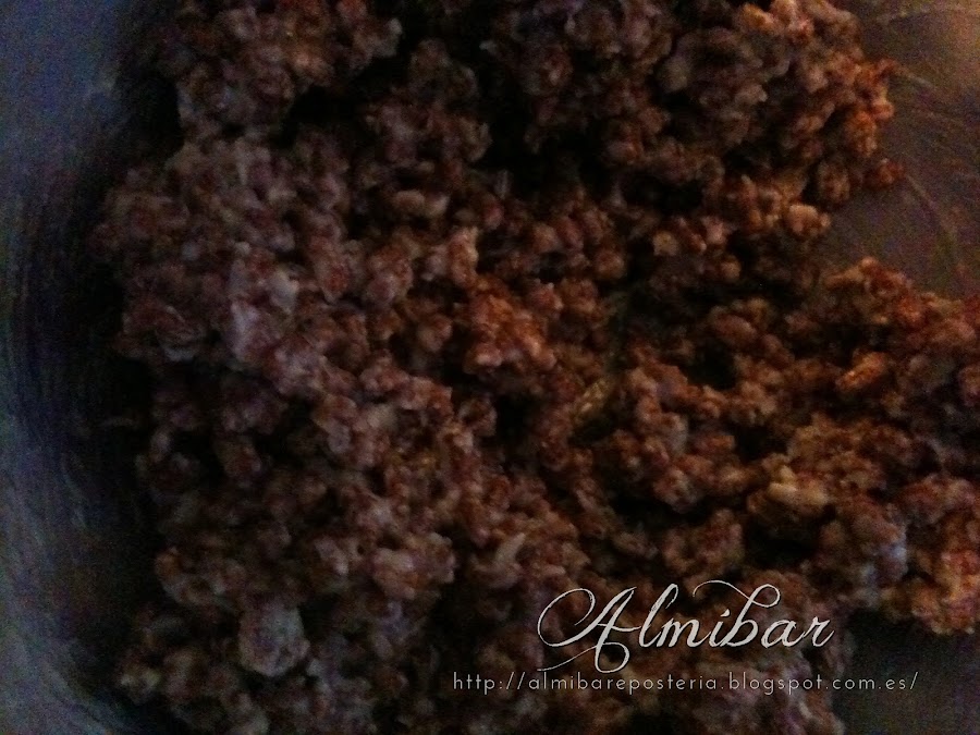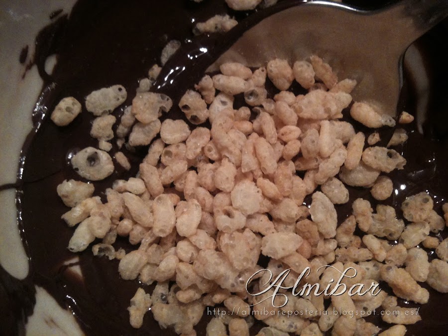 ...incorporas el arroz inflado con cacao a la mezcla de chocolate blanco...