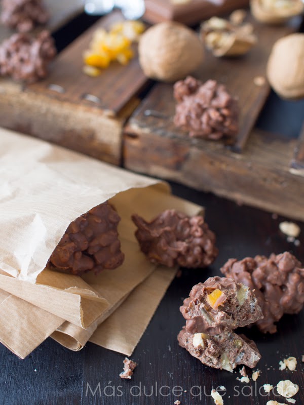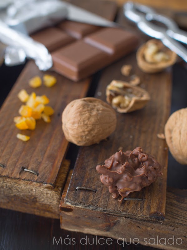 A mi la combinación de naranja con chocolate me pirra, y como aun tengo restos navideños dando tumbos, le he añadido naranja confitada y unas nueces que nunca faltan en casa.