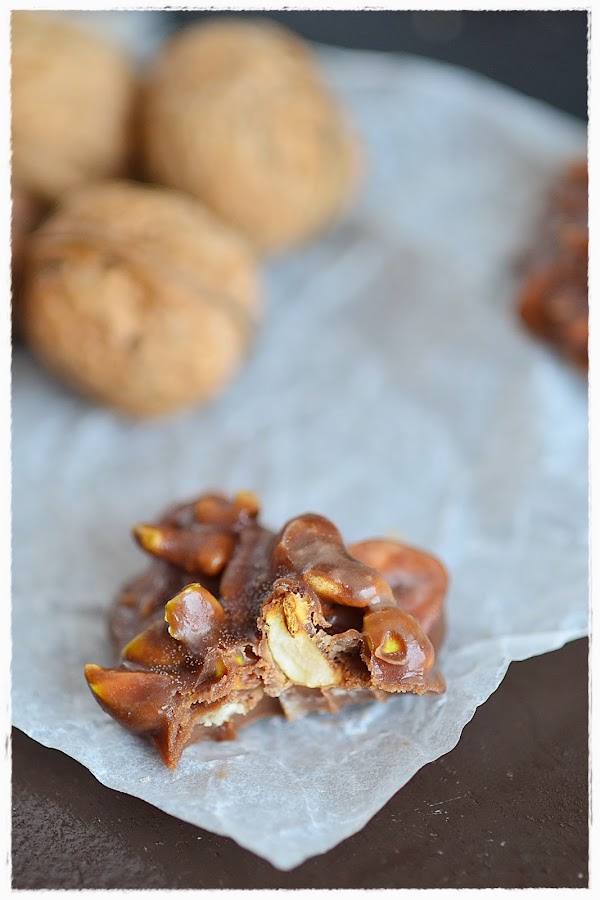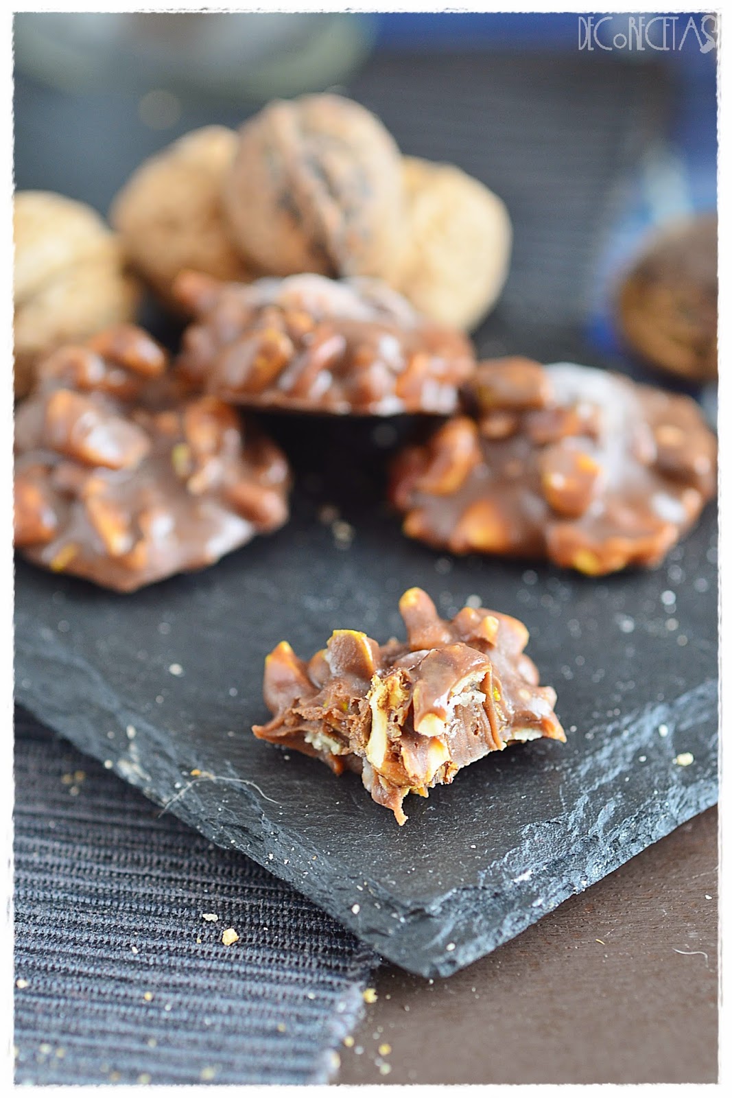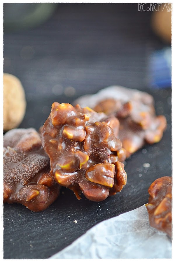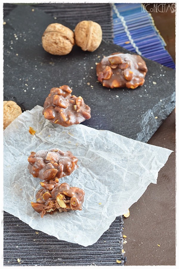 Derretimos el chocolate al baño maría o en el microondas y añadimos los frutos secos que dispongamos en casa. Depositamos encima de papel de horno intentando hacer los montoncitos de igual tamaño y dejamos enfriar por completo antes de manejarlos.