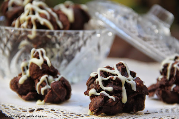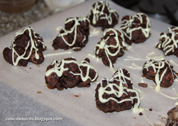 Inmediatamente después (no dejamos pasar tiempo para evitar que se solidifique el chocolate) tomamos porciones y las colocamos sobre papel. Una vez que han solidificado las decoramos, si queremos, con un poco de chocolate blanco derretido.