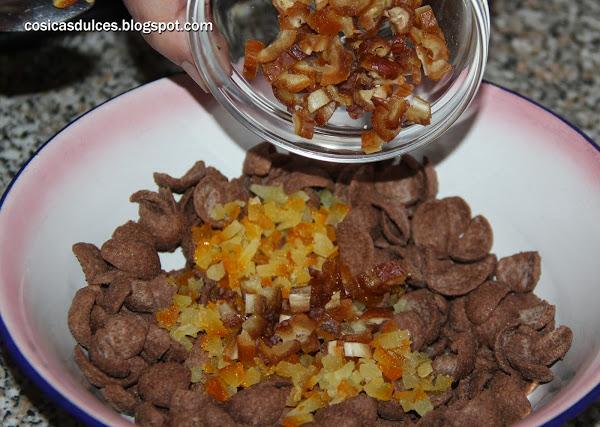 Hace días que daban vueltas por casa unas bolsitas de cereales para el desayuno de mi caja Degustabox. Las pobres esperaban ansiosas en el armario a que alguien las tomase para desayudar, pero el problema es que en casa somos más de tostadas. Como tenían un aspecto bastante rico pensé que había que buscar una alternativa para ellas. Rápidamente me vino a la mente preparar las clásicas rocas de chocolate. Me fui a la despensa en busca del chocolate y una vez allí encontré una bolsita de dátiles y unos resto de naranja confitada de la Navidad así que con esta mezcla de ingredientes me puse manos a la obra. El resultado: rico rico, os lo prometo. Espero que os gusten.