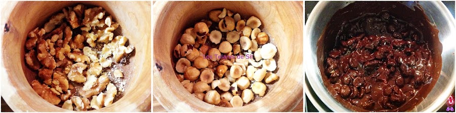 Pica las avellanas y las nueces y añade al chocolate fundido. Mezcla bien.