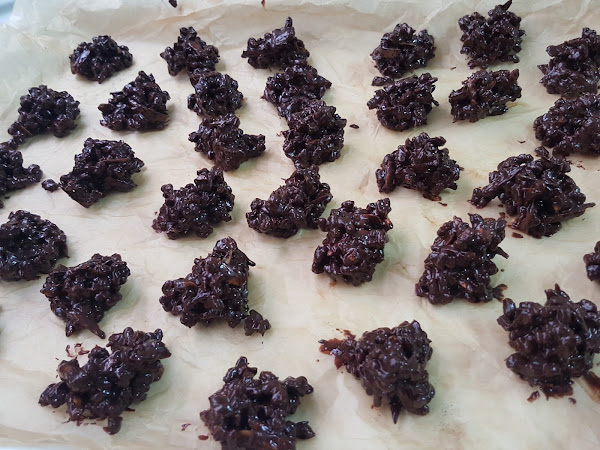 8. - Y ya sólo queda coger dos cucharillas de postre y vamos poniendo porciones sobre bandejas, moldes, papel de aluminio..... y dejamos enfriar hasta que endurezcan.