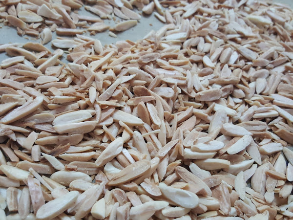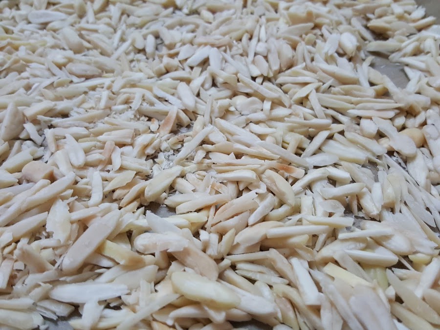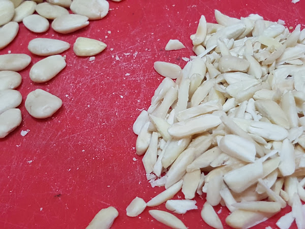 1. - Lo primero que haremos será, con paciencia, cortar las almendras en tiras, esto lleva su ratito....