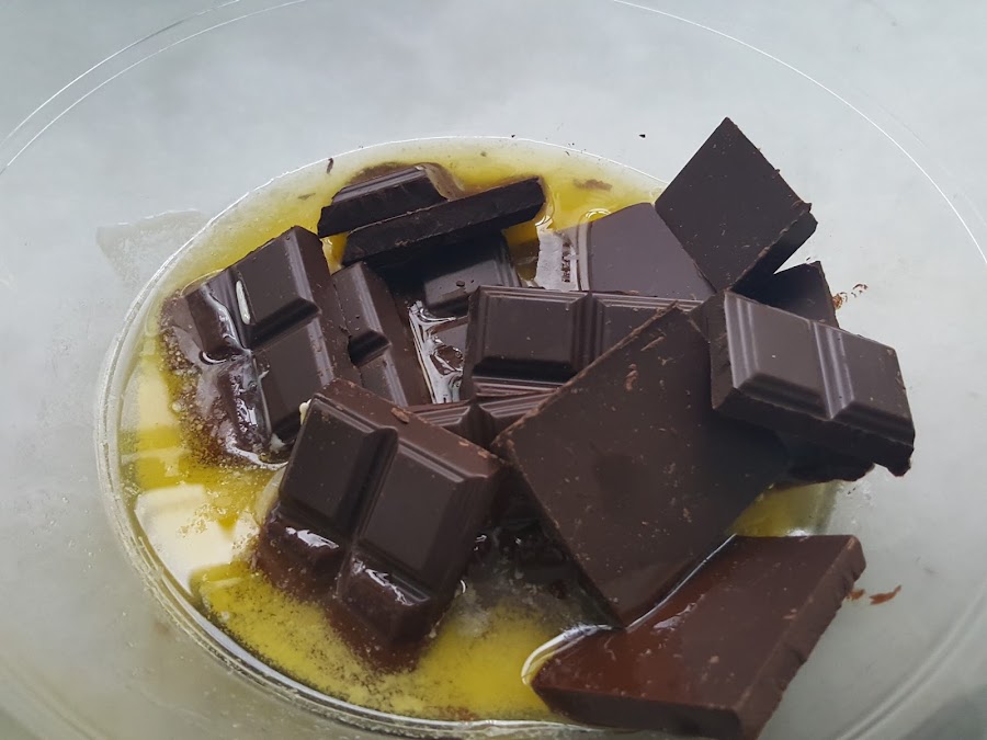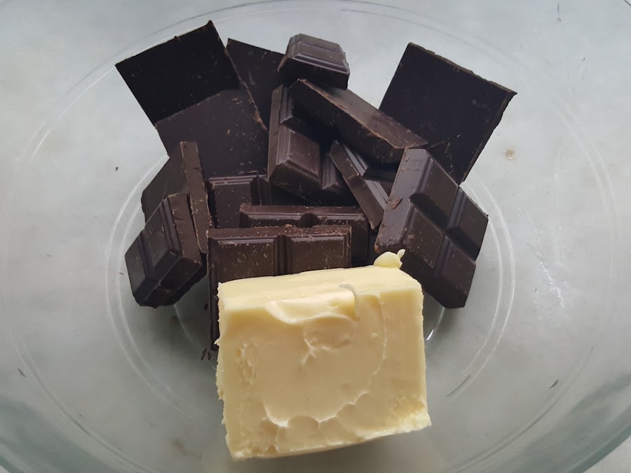 4. - En un bol ponemos el chocolate troceado y la mantequilla y metemos en el microondas 1 minuto, removemos para que se vaya derritiendo el chocolate.