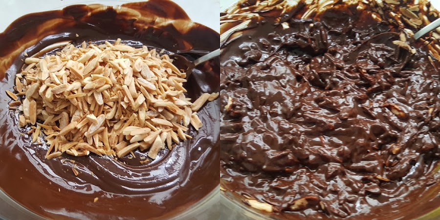6. - Añadimos la almendra tostada al chocolate y mezclamos.