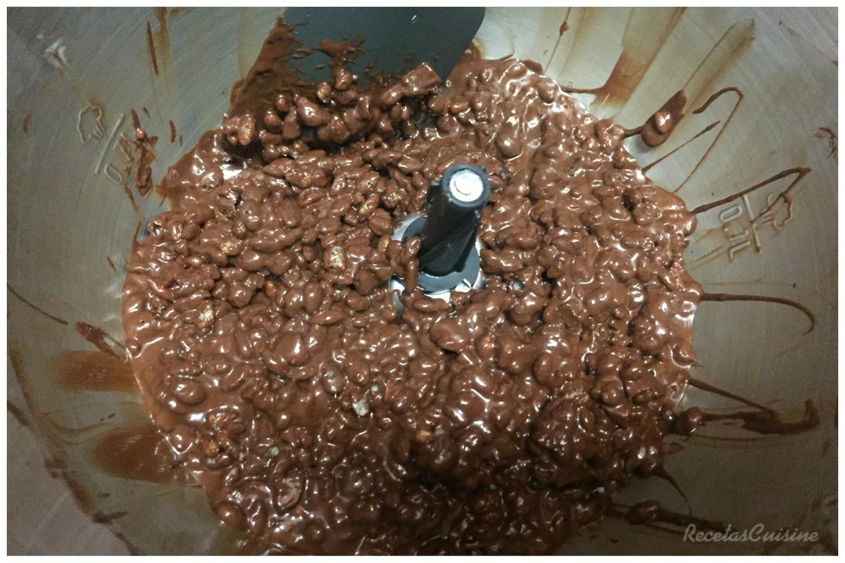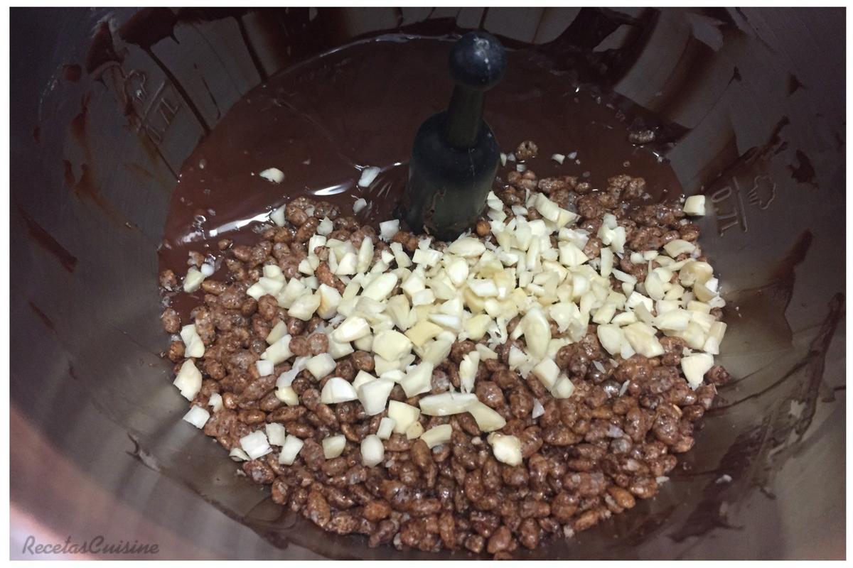 2. Mientras picamos con el chuchillo los 20gr de almendra, lo dejamos en trocitos pequeños. Cuando tengamos el chocolate bien fundido, añadimos la almendra picada y el arroz inflado. Mezclamos con velocidad 5 unos segundos. Terminamos de mezclar con la espátula.