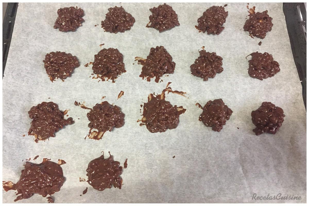 3. Forramos una bandeja o fuente con papel de hornear. Con una cucharilla, vamos cogiendo porciones del bol y colocamos sobre el papel de hornear, haciendo montoncitos separados entre sí. Guardamos en la nevera durante 2-3 horas.