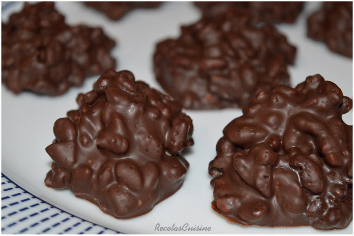 Tenía media bolsa de arroz inflado chocolateado, que lo compré para hacer turrón de chocolate crujiente. Como en casa no somos de desayunar cereales, pensé en algo para gastarlo y justo vi en una revista de postres que hacían estas rocas. Al final la cambié alguna cosilla, y añadí también unas almendras. Este es el resultado, molan mucho, y si las hacéis para acompañar los turrones de la sobremesa estas navidades, seguro que son un éxito.