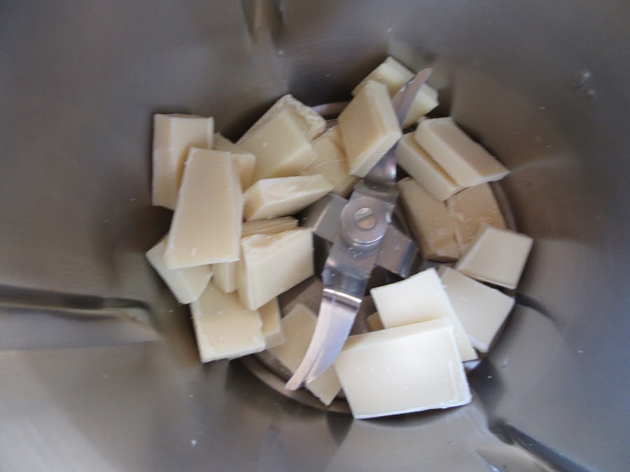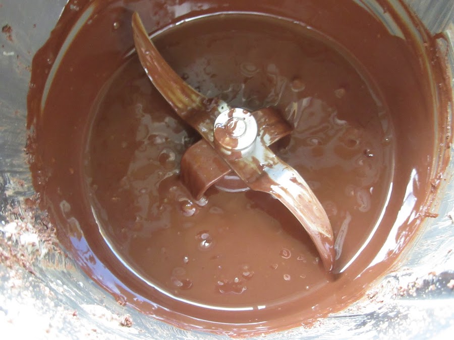 1- Moler el chocolate con golpes de turbo, bajar paredes y despegar fondo. Añadir el aceite, 2-3 min. 50º, vel.2. Que quede todo bien fundido.
