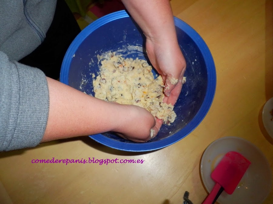 Ahora puedes mezclar, empieza si lo deseas removiendo con una espátula, luego te animo a meter las manos en la masa, es muy gratificante.