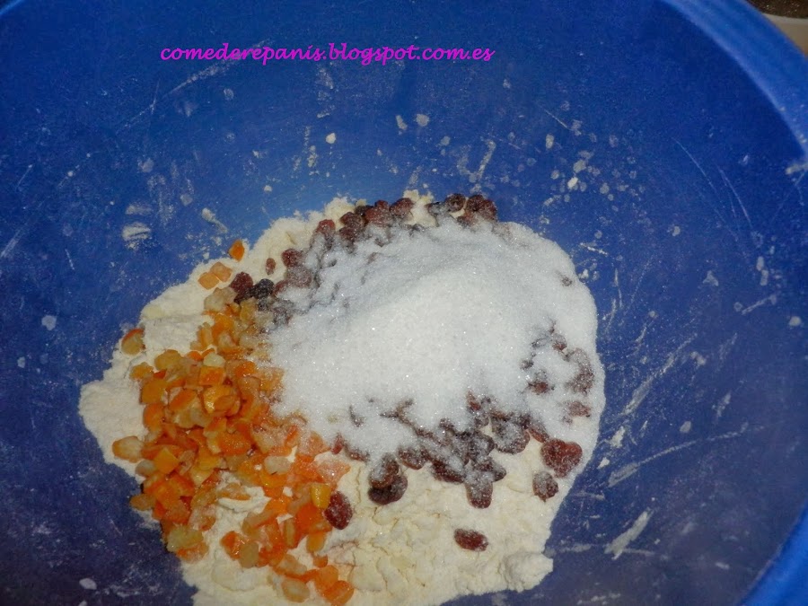 Añade las pasas, la fruta escarchada, el azúcar y el huevo batido.