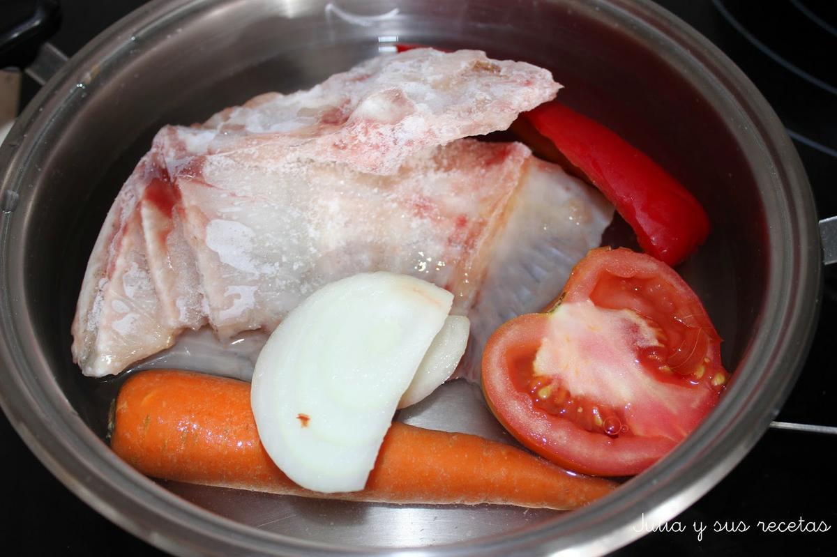 Hacemos el caldo de pescado con la espina del rodaballo, 1 tomate, 1 zanahoria, pimiento rojo, 1/2 cebolla, agua y sal. Lo dejamos cocer unos 30 minutos y lo colamos.