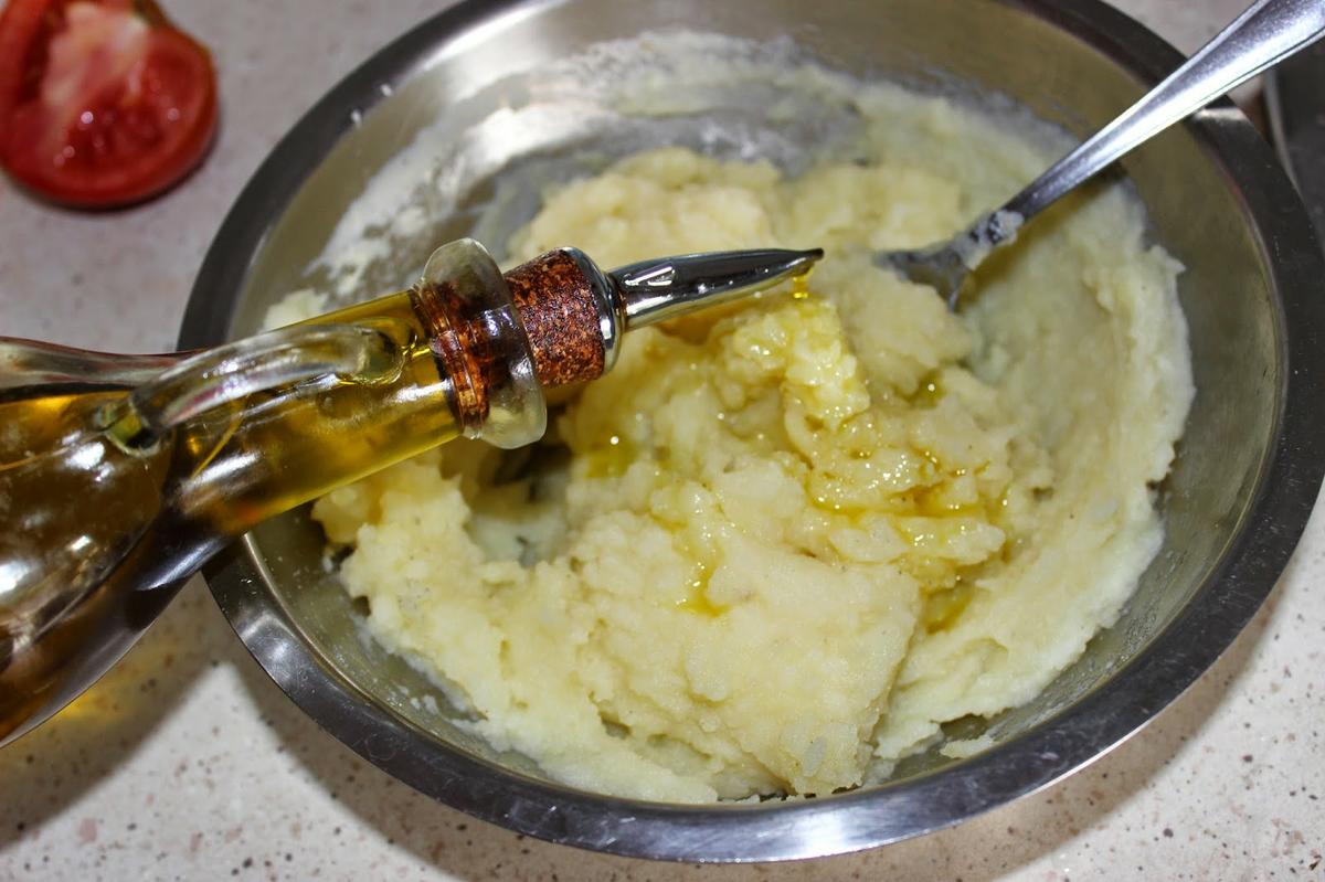Pelamos las patatas y las cocemos en agua con una poquita sal. Las escurrimos y las pasamos por el pasa pures. Las aliñamos con sal y pimienta molida al gusto, un chorrito de leche para suavizar el sabor y un chorrito de aceite de oliva virgen. Lo reservamos.