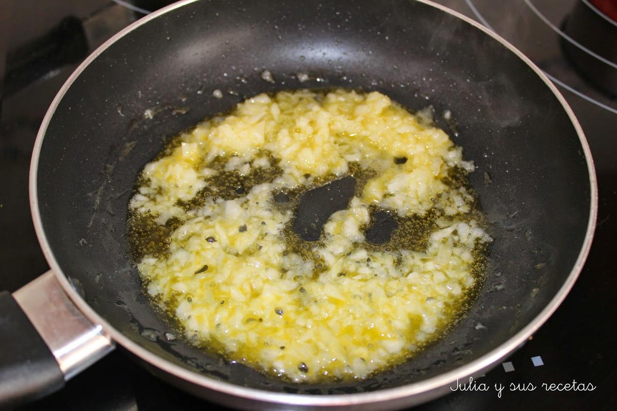 Mientras se hace el pescado, en una sarten ponemos el aceite y la margarina y sofreímos las cebolla troceada muy finita.