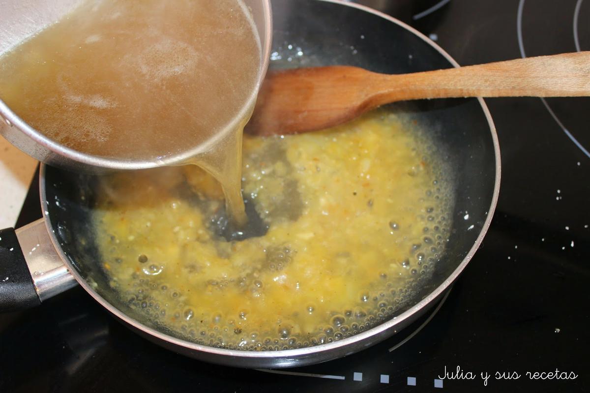 Cuando esté sofrita añadimos la cucharadita de maizena, removemos y añadimos el vino blanco, el coñac, el caldo de pescado.