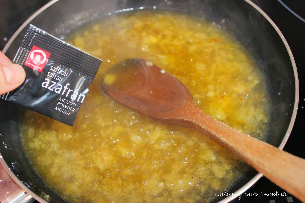 Añadimos el azafrán molido (una bolsita, mas o menos la punta de una cucharilla de café) y si no tenemos molido pues le ponemos en hebra..