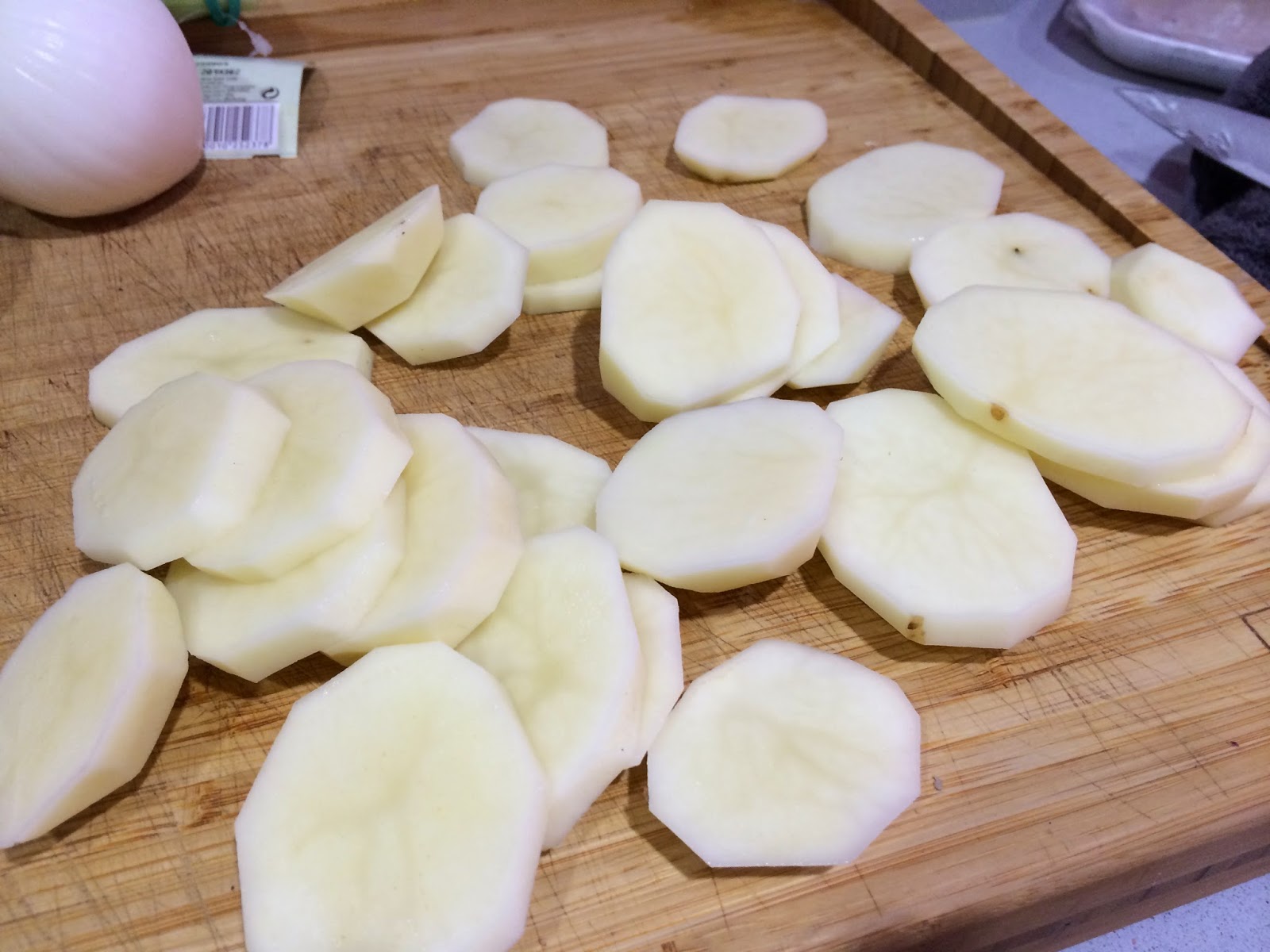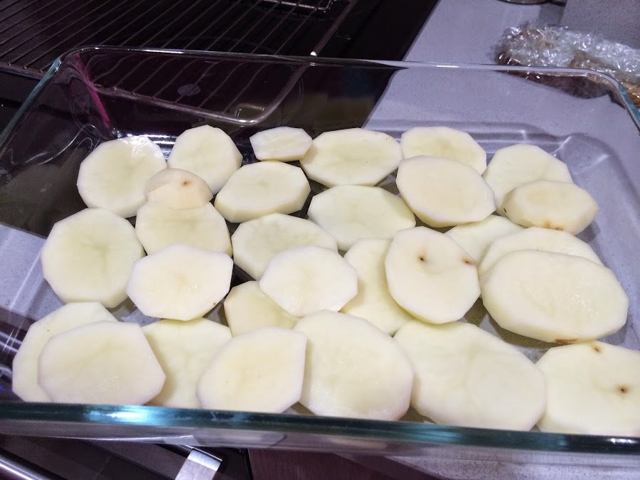 2. Cortamos en rodajas de medio o un cm las tres patatas.