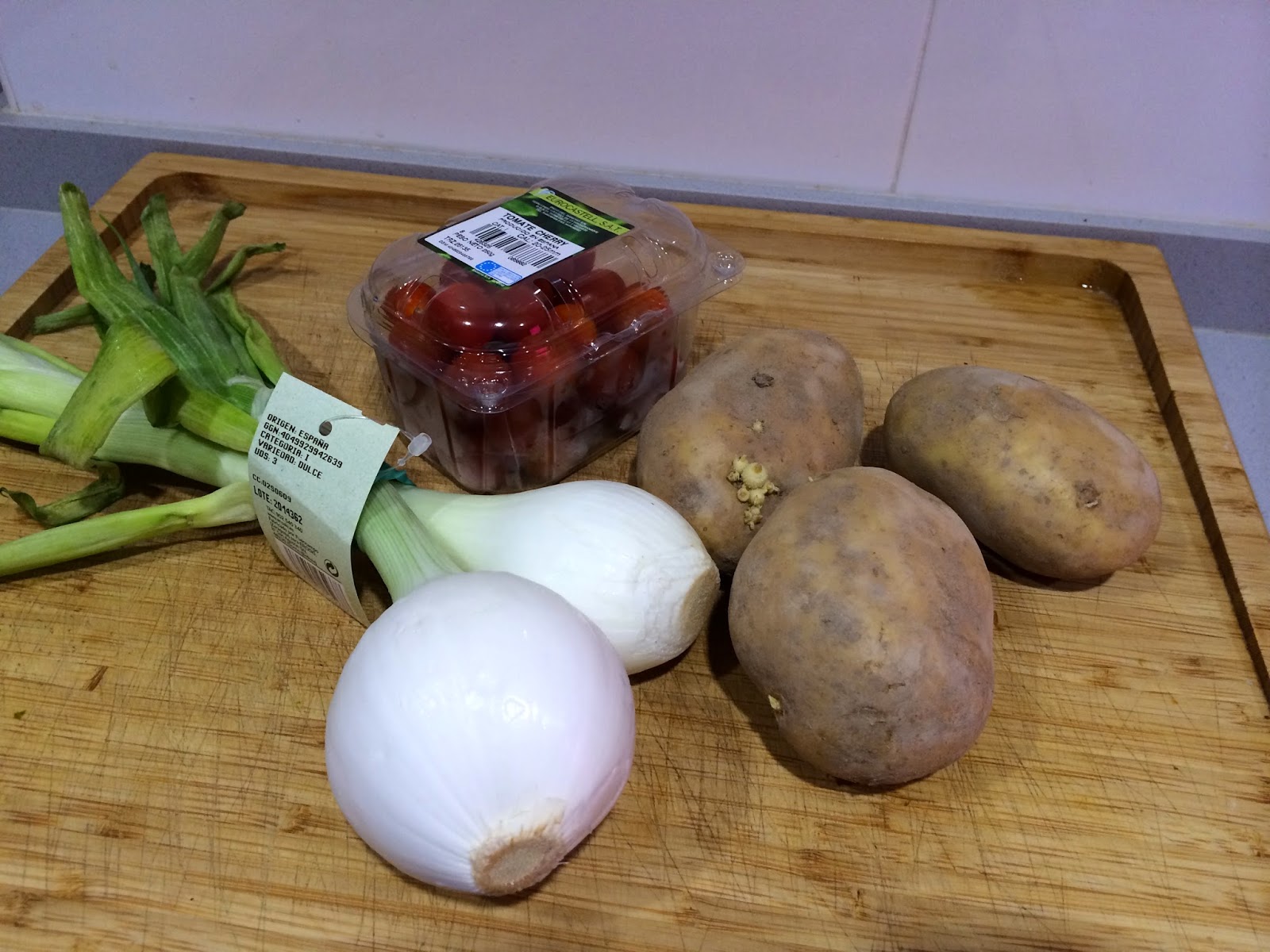 Paso a paso:1. Precalentamos el horno a 180ºC. Mientras preparamos las hortalizas. Pelamos las patatas y las cebollas, y las lavamos junto con los tomatitos cherrys.