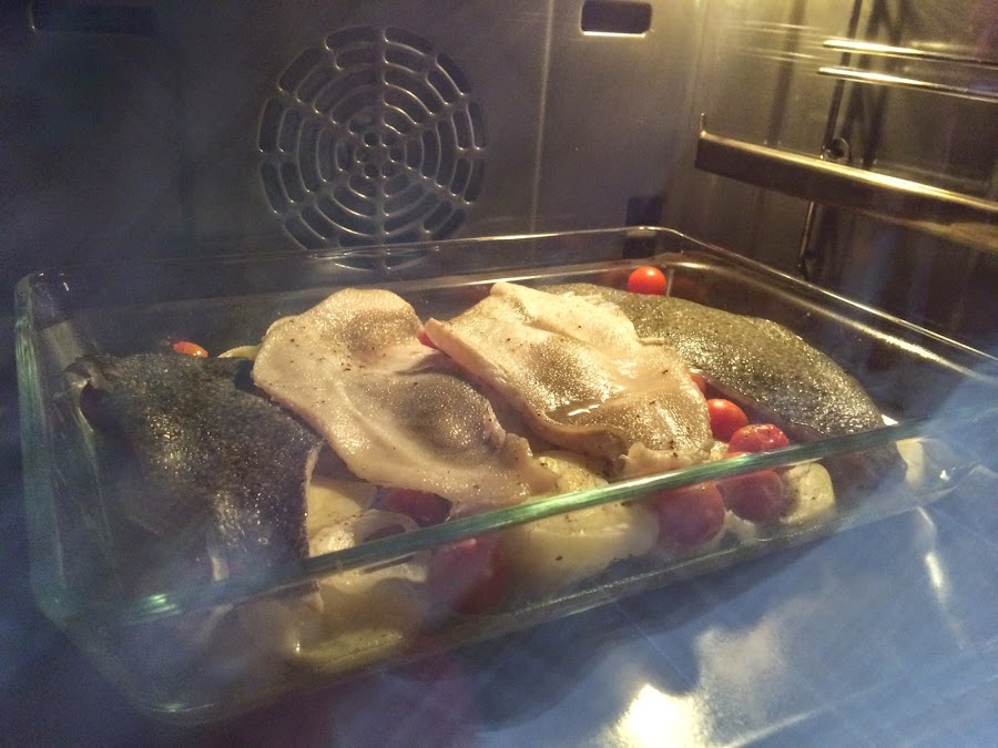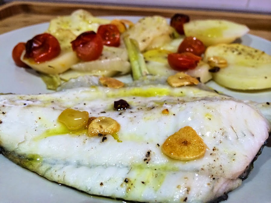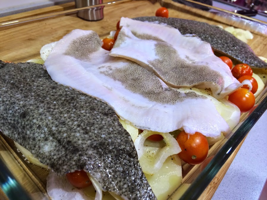 6. Cuando hayan pasado los 30 minutos sacaremos las hortalizas del horno y pondremos encima los 4 filetes de rodaballo, le pondremos el vaso de vino blanco por encima y salpimentaremos. Hornearemos durante 15 minutos mas.