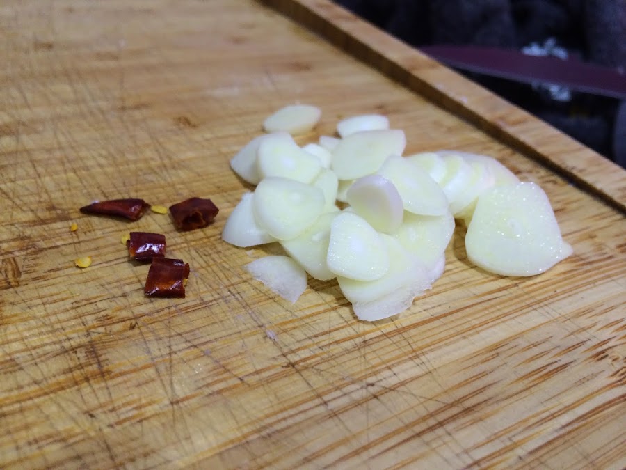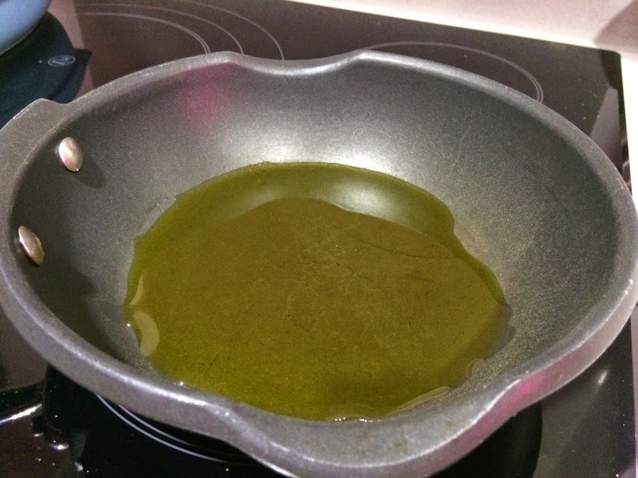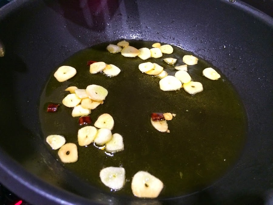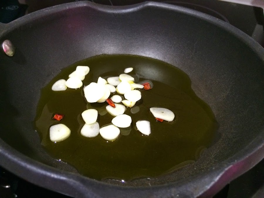 7. Mientras se acaba de hacer prepararemos la frita de ajo y guindilla. Podremos en una sartén unas 5 cucharadas de AOVE. Freimos los ajos junto con la guindilla hasta que esten doraditos.