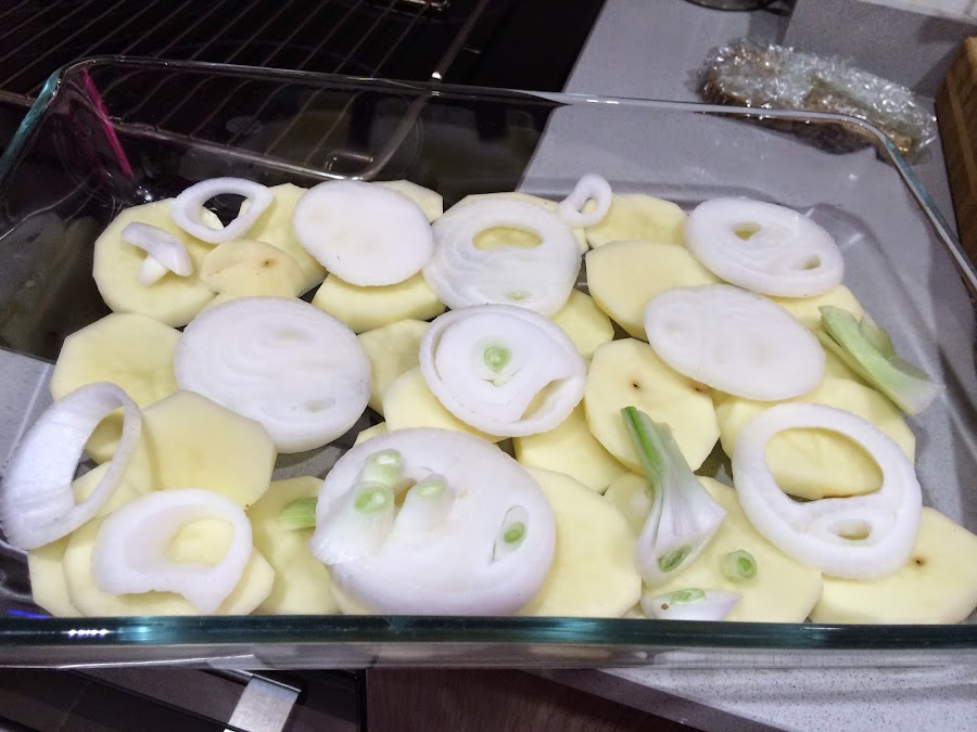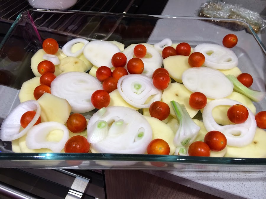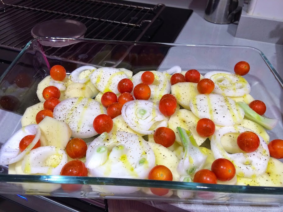 4. En una bandeja de horno ponemos las patatas en el fondo, las cebollas encima y los tomatitos por encima. Salpimentamos, añadimos un chorrito de aceite y horneamos durante 30 minutos a 180ºC.