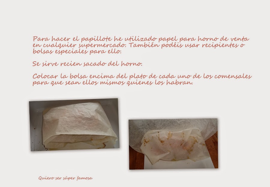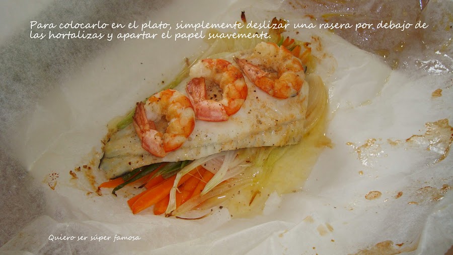 Colocar sobre papel para horno las hortalizas cortadas en juliana fina (utilizar también la parte verde más tierna de la cebolleta. Encima un filete de rodaballo y tres langostinos por comensal. Condimentar con sal, pimienta blanca, un hilo de aceite de oliva, y la reducción del fumet convertido en un riquísimo condimento con sabor a marisco, pero muy suave.