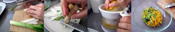 Cortar la cebolleta fresca y rallar el jengibre. Exprimir el zumo de la naranja, lima y limón. Cortar en finas tiras las pieles de los cítricos.