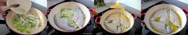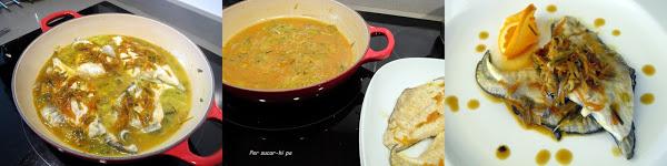 Cuando la cebolleta esté blanda, colocar los filetes de rodaballo, previamente sazonados, y verter por encima unas tres cuartas partes del zumo de cítricos. Dejar cocer a fuego medio.