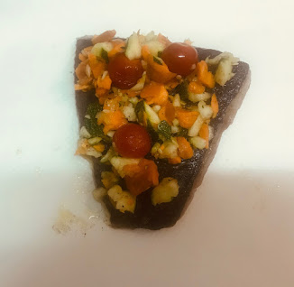 Pon cada filete de rodaballo sobre un papel de horno (o albal), cubre con las verduras reservadas y tres tomates cherry,
