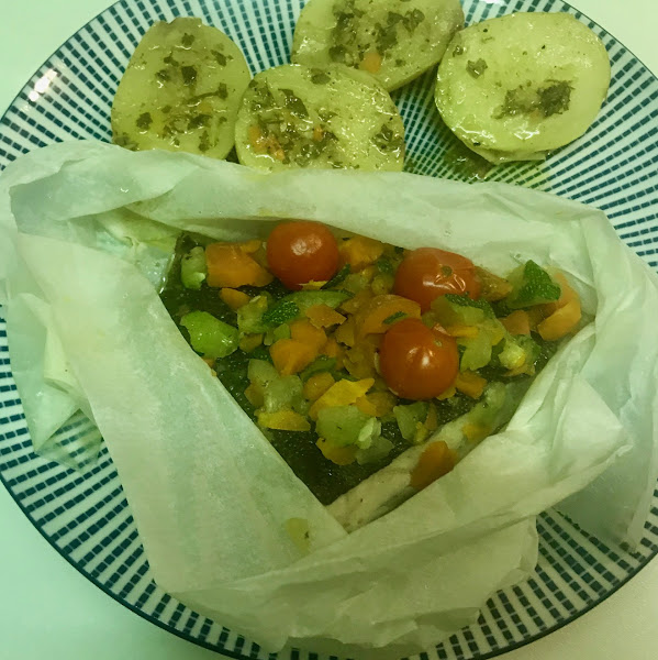 Con estos calores solo apetece comer cosas ligeras, hoy os traigo un rodaballo en papillote con verduritas y patatas aliñado con un aceite de limón y perejil que está muy rico, vamos a por la receta!!!Ingredientes para 2 raciones: