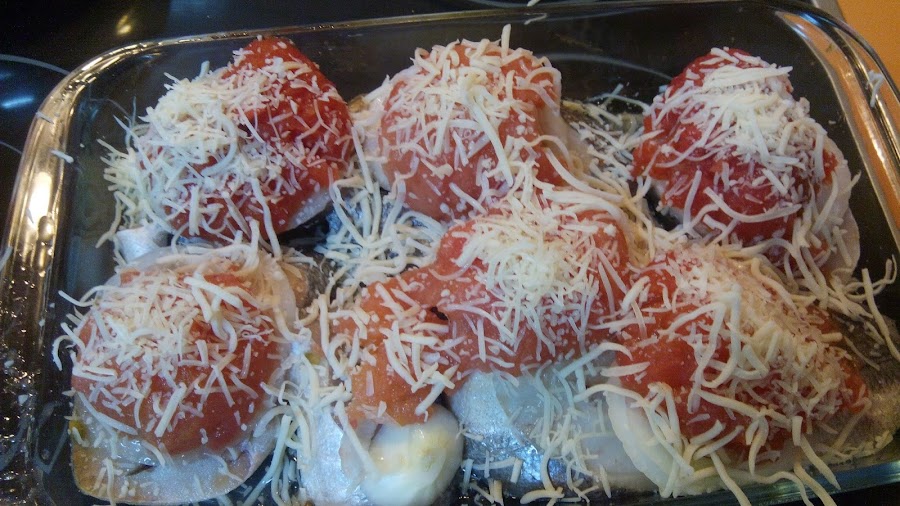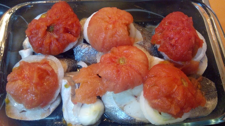 Una vez pelados los tomates, los cortamos a rodajas y los ponemos encima de las cebollas.
