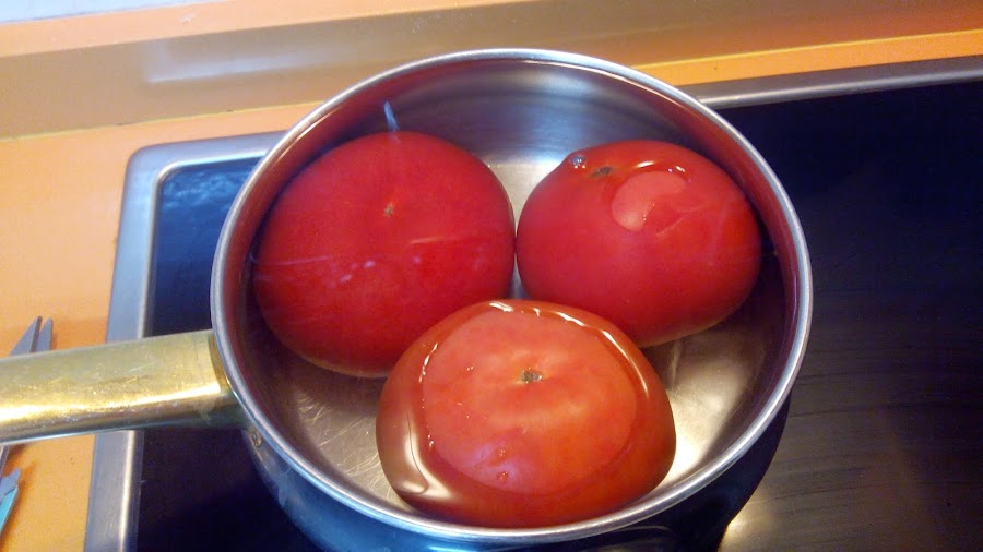 Ahora escaldamos los tomates para pelarlos con facilidad y ponemos a precalentar el horno a 180 grados.