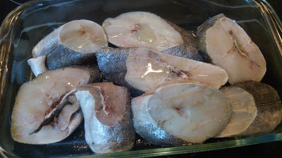 Untamos con aceite el fondo de una fuente apta para horno y colocamos en ella las rodajas de merluza.